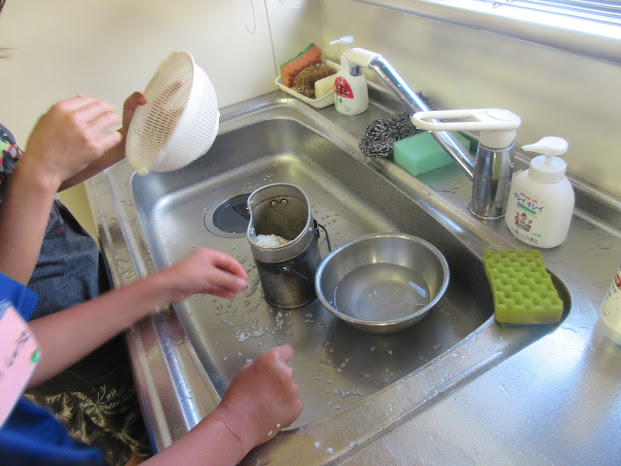 飯盒の準備中。お米を飯盒に入れるのに苦戦しています。